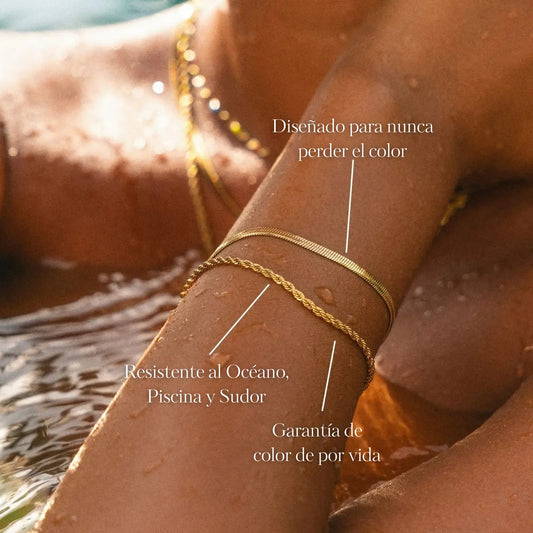 La combinaciĂłn perfecta entre estilo y resistencia que se adapta a cada momento de tu vida. Elaborada con tecnologĂa PVD, un proceso premium que crea una capa 10 veces más gruesa que el baño de oro normal, estas piezas están diseñadas para acompañarte para siempre, brillando contigo en cada aventura.