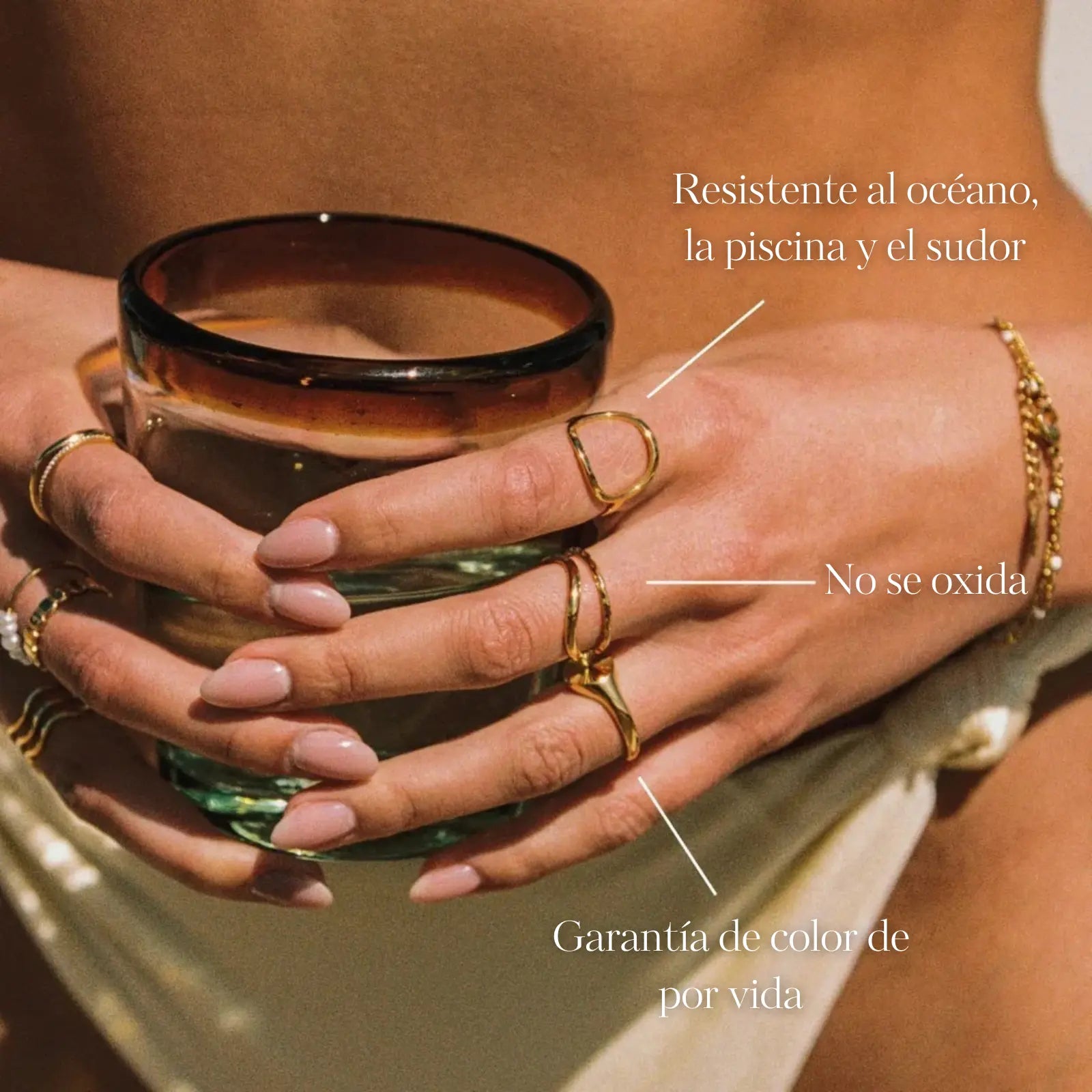 Todas nuestras piezas son impermeables, resistentes al sudor, hipoalergénicas, antidecoloración y compatibles con cosméticos.